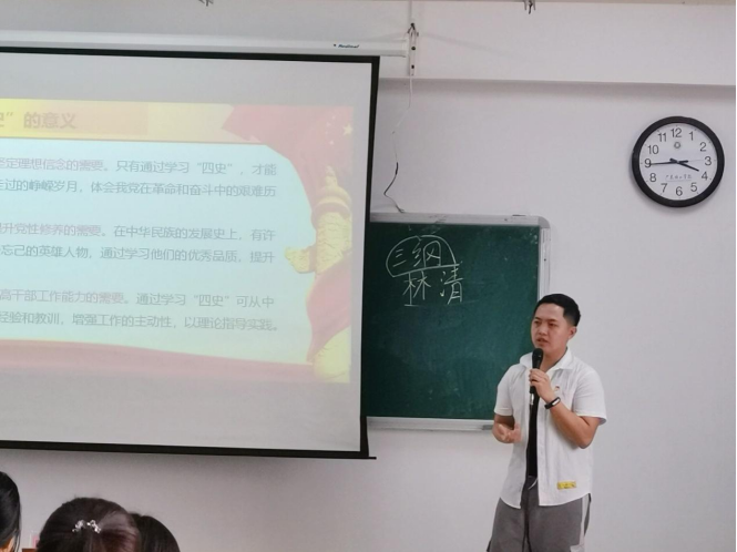 “第一课”从介绍何为“四史”教育讲起,叶梓龙同志结合实际情况,给同志们讲述了“四史”:中共党史、新中国史、改革开放史、社会主义发展史。接着,叶梓龙同志又指出:“四史”学习教育是坚定理想信念的需要、是提升党性修养的需要、是提高干部工作能力的需要、是帮助同志们更好地传承党的红色基因,并举出实例让同志们更好地了解。最后,通过观看2020年党支部三下乡的视频—号召同学们积极参与三下乡活动,号召同学们了解故乡的红色故事、挖掘红色经典。