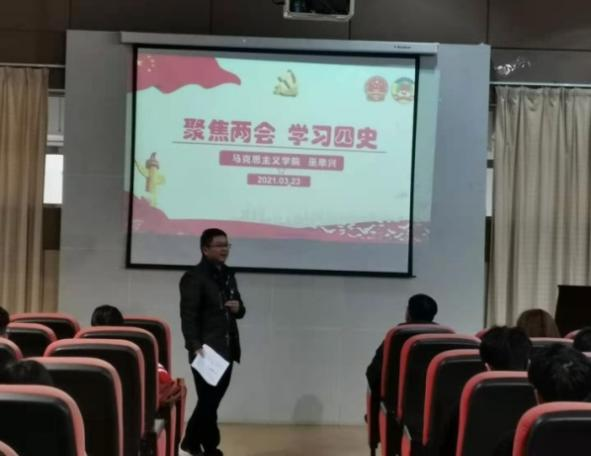 本网讯(校团委 洪淑霞)为进一步加强我校学生干部队伍建设,提高学生的党性修养,2021年3月23日下午14:00,我校在学生活动中心613室举办“第三期青马工程(菁英班)”培训,讲授第二课《聚焦两会,学习四史》。校团委老师与全体青马三期学员八十余人参加。马克思主义学院党总支书记巫幸兴老师授课,校团委常务副书记曾营主持讲座。