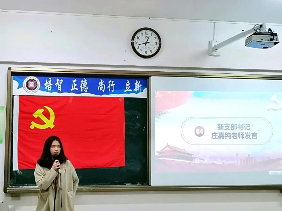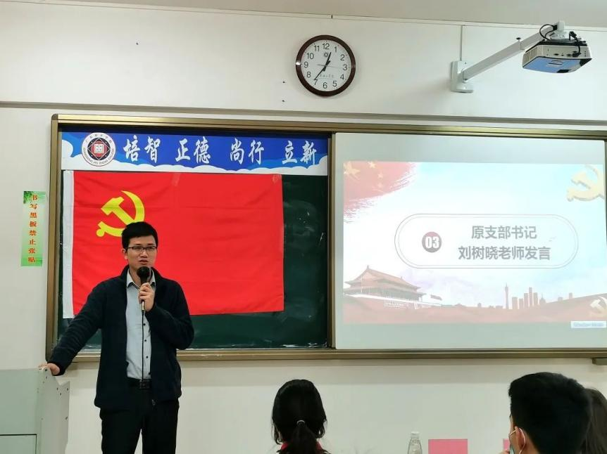接着,由原支部书记刘树晓老师总结上任以来支部发展状况并给予寄语。重点强调支部成员需秉承“实干、担当”的精神,用党的先进理论武装头脑,也希望支部在本学期能够将党史学习教育落实到位,推动党史学习教育融入日常生活,融入到“三会一课”当中;同时表示会一如既往地关注支部情况,期待着支部的发展更上一层楼。