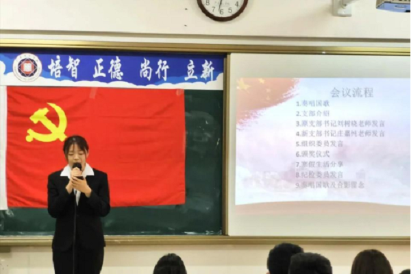 会议伊始,全体成员起立,奏唱国歌。主持人刘韩对支部构架与支部情况进行了介绍。