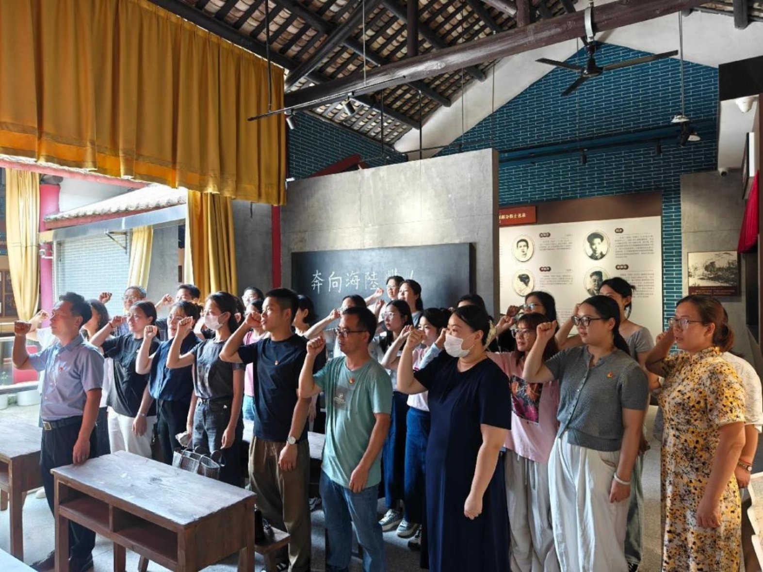 在遗址展厅里的党旗前,外国语学院党委书记陈橹带领全体教工党员重温入党誓词。党员同志们高举右拳,铿锵有力的誓言回荡在红色旧址上空:“我志愿加入中国共产党……为共产主义奋斗终身,随时准备为党和人民牺牲一切,永不叛党!”