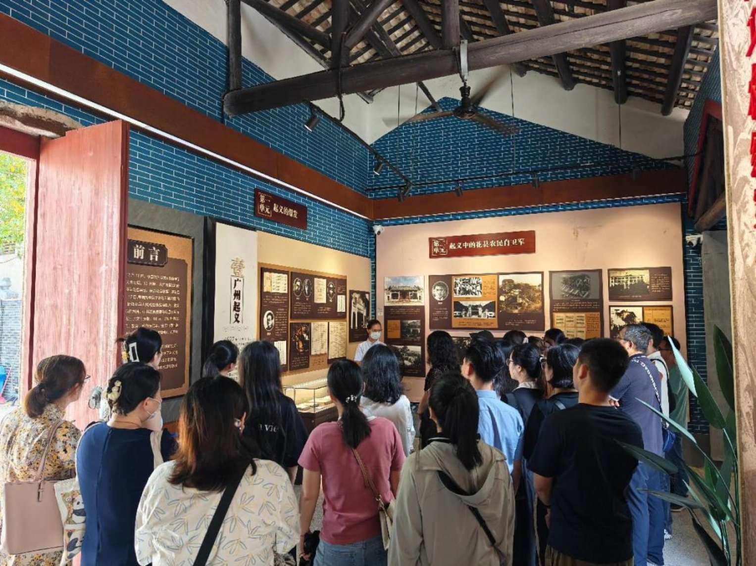 本网讯(外国语学院 谢昭鸿)6月6日,外国语学院教工党支部赴广州市花都区中国工农红军第四师成立大会遗址开展主题党日活动。在遗址展厅内,党员们跟随讲解员沉浸式参观《旗展花县——中国工农红军第四师历史展陈》,深入了解了红四师从广州起义、花县整编到奔向海陆丰的艰苦历程。一幅幅照片还原了革命低潮时期红军将士“艰忍卓绝为吾人本色,艰苦奋斗是我辈精神”的铮铮铁骨,一段段文字记载了部队在血火洗礼中坚守理想信念、整编再出发的转折。
