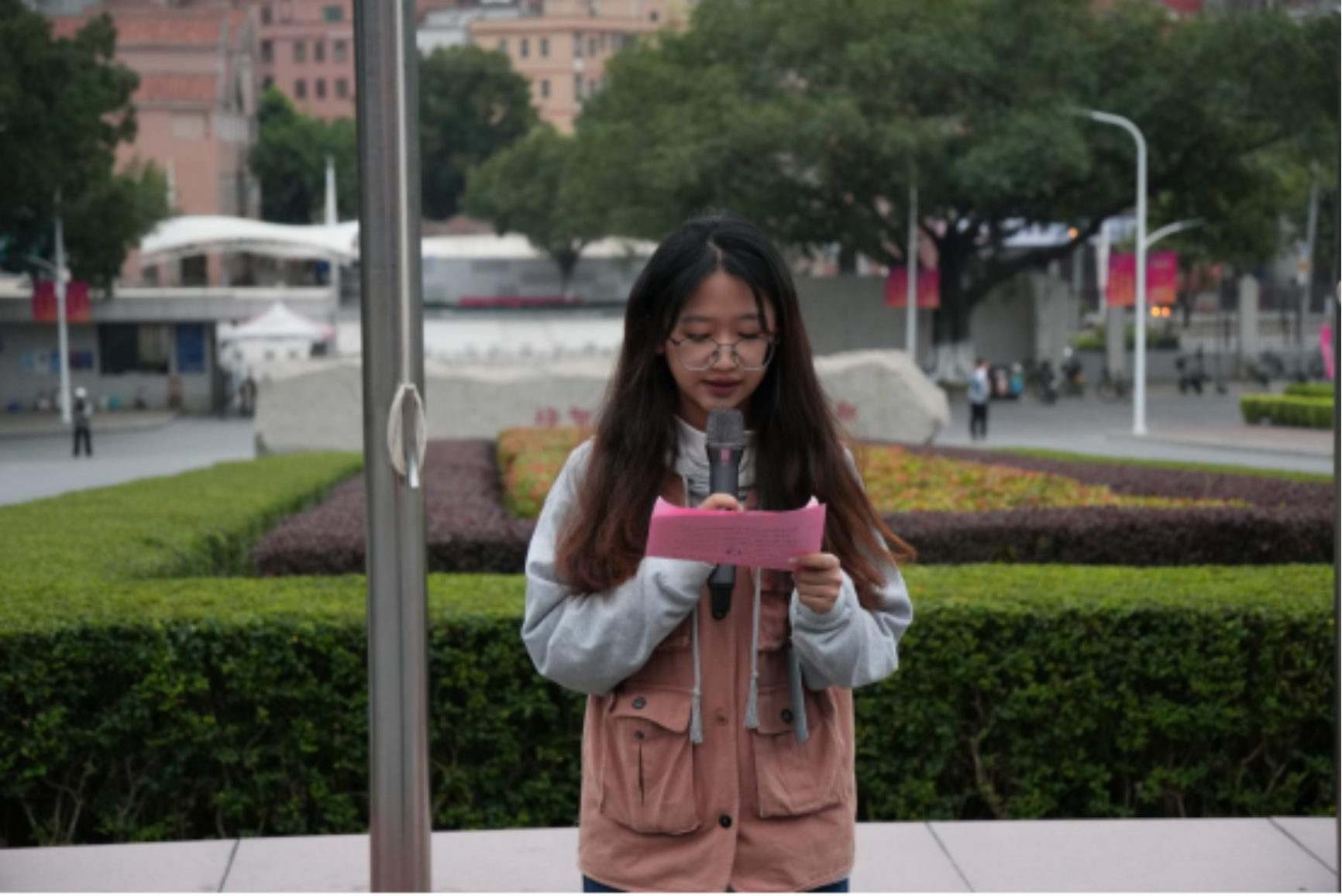 艺术学院学生预备党员文菊在国旗下讲道:“南京大屠杀是中华民族永远不能忘却的伤痛!这是一段血泪史,是一段苦难史,更是一段屈辱史!勿忘国殇,就是对南京大屠杀及侵略战争中死难者同胞最肺腑的悼念,就是对为实现民族独立,保护祖国主权与领土完整,前仆后继,艰苦卓绝,不怕牺牲,英勇战斗,取得伟大胜利的无数革命先烈最崇高的敬意。作为新时代青年学子,我们要将这段血与火的历史刻印在心,以史为鉴,珍爱和平,更要紧紧凝聚在以习近平同志为核心的党中央周围,砥砺奋进,向第二个百年奋斗目标,中华民族伟大复兴而踔厉奋发,勇毅前进。