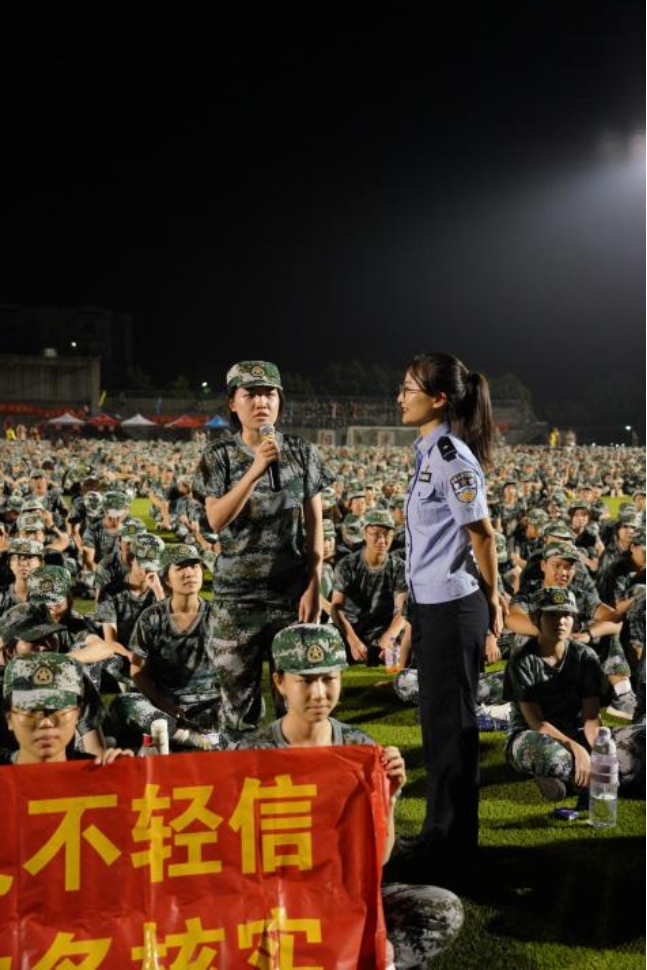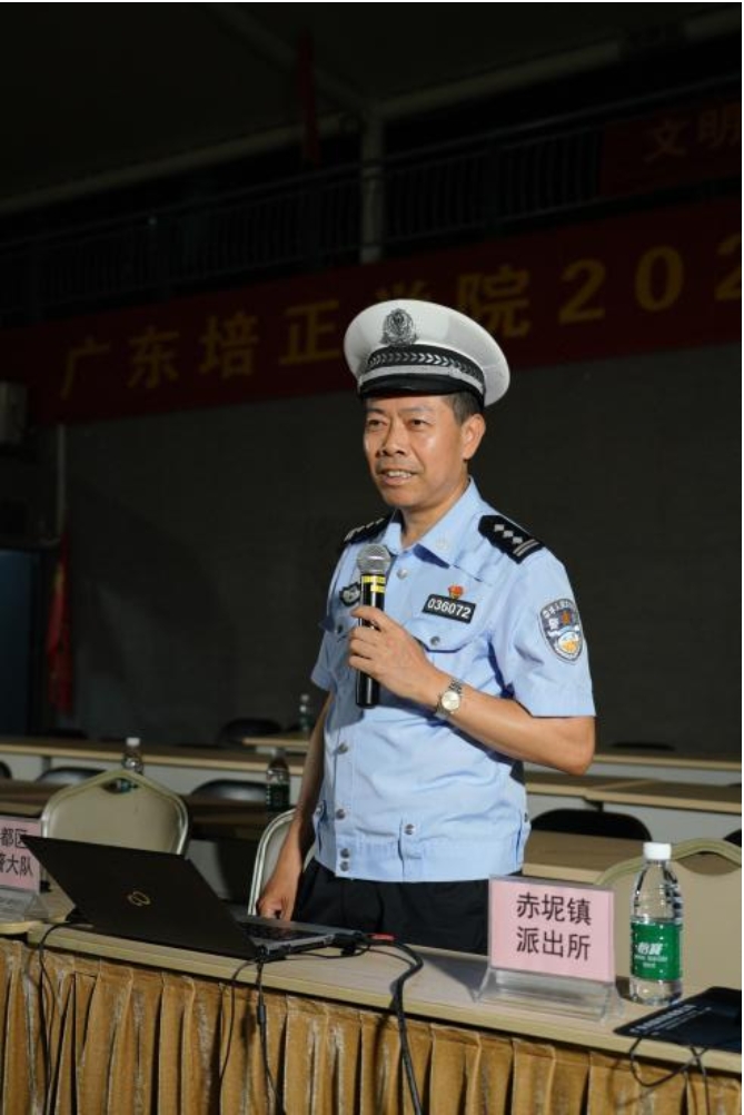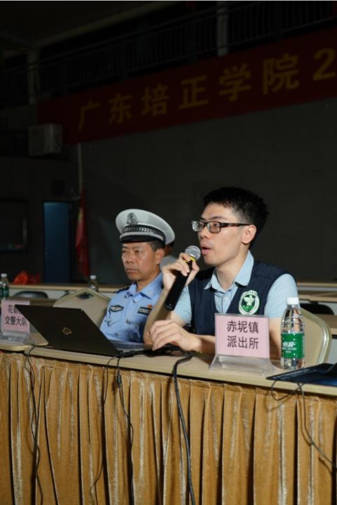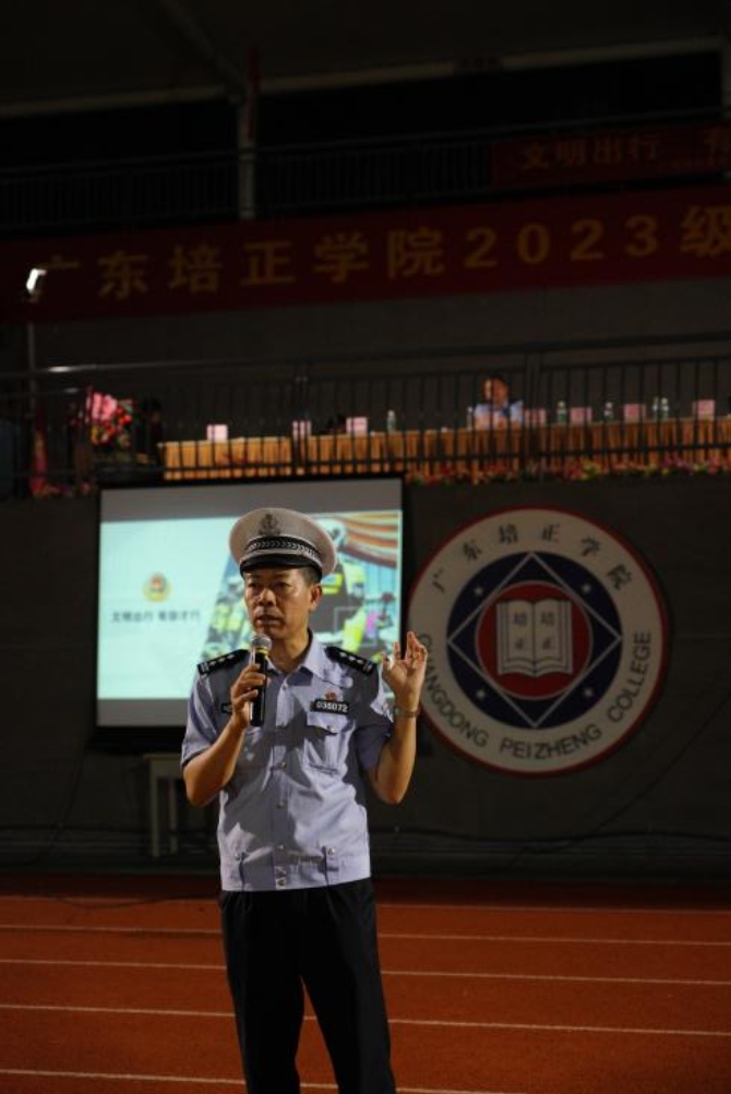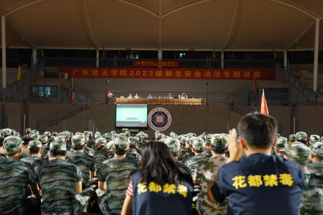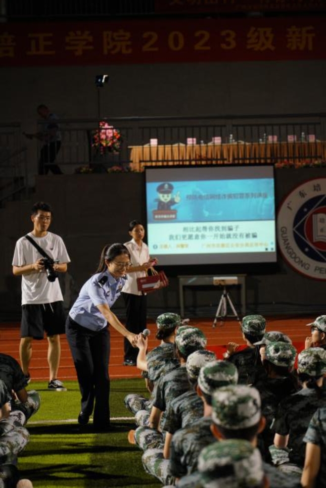 本网讯(学生工作部 罗钊)9月12日19:00在足球场成功举办广东培正学院2023级新生安全法治专题教育讲座。花都区反诈中心警官林思贝、刘俊,花都区交警大队高级警官林洁群,赤坭镇派出所副所长刘耀颜、警官梁志标,赤坭镇禁毒办曹聪聪,农业银行花都分行贺伟科长,学校武装部部长、学生工作部部长黄海峰,保卫处处长唐伏龙参加讲座,武装部副部长、学生工作部副部长黄志均主持,与会师生达4200人。