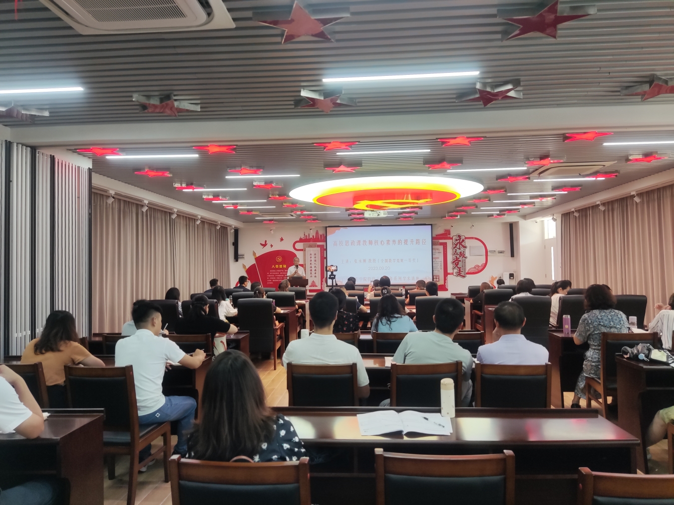 本网讯(马克思主义学院 熊琴)2023年9月20日下午,马克思主义学院于党建文化中心举行教学竞赛经验分享的讲座,特地邀请了获得全国教学竞赛一等奖的华南师范大学马克思主义学院的张永刚教授。本次讲座的主题为《高校思政课教师核心素养的提升路径》。讲座由马克思主义学院易钢院长主持,马克思主义学院全体教师、广东培正学院校团委、学生处部分老师及有关学院部分辅导员参加。