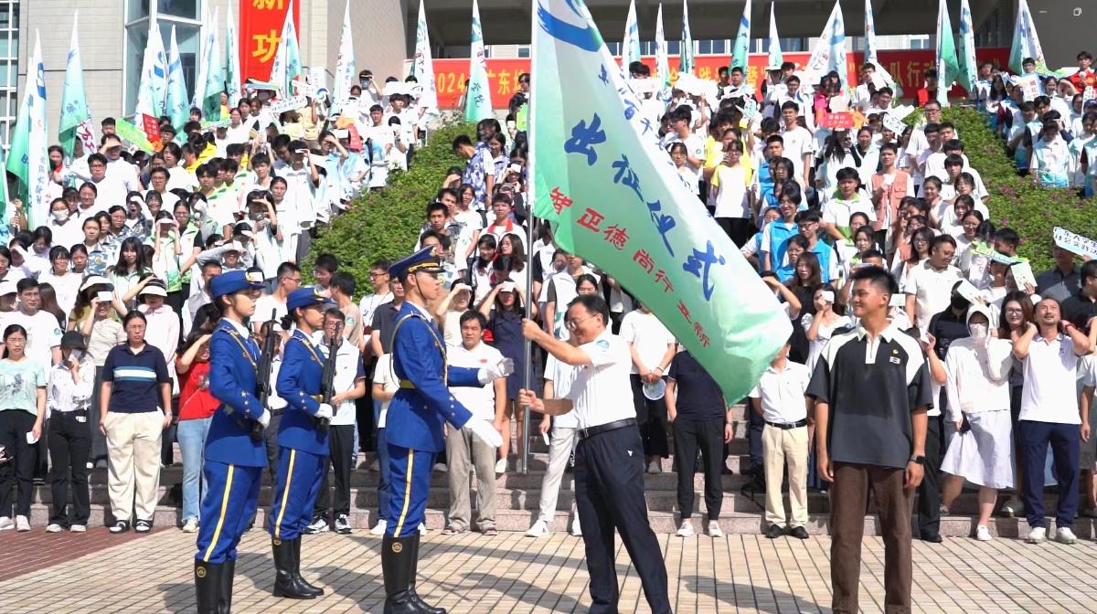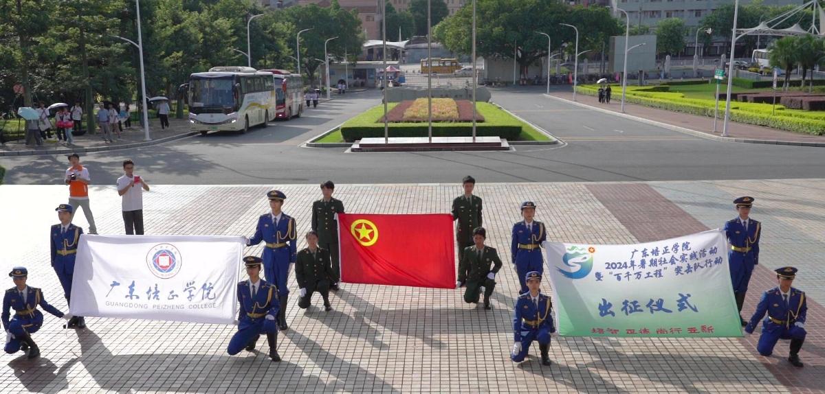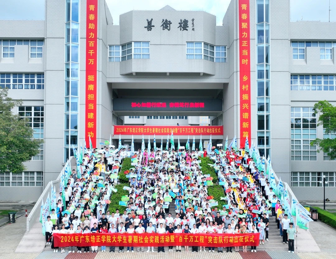 本网讯(校团委 苏金恒)7月11日早上, 2024年广东培正学院大学生暑期社会实践活动暨“百千万工程”突击队出征仪式在第一教学楼前举行,校党委书记武电平,校党委副书记邓惠出席,校党委委员、校团委书记阮霖,学生工作部部长黄海峰,学生工作部副部长黄志均,各二级学院党委书记、团委书记,带队教师和学生代表参加。