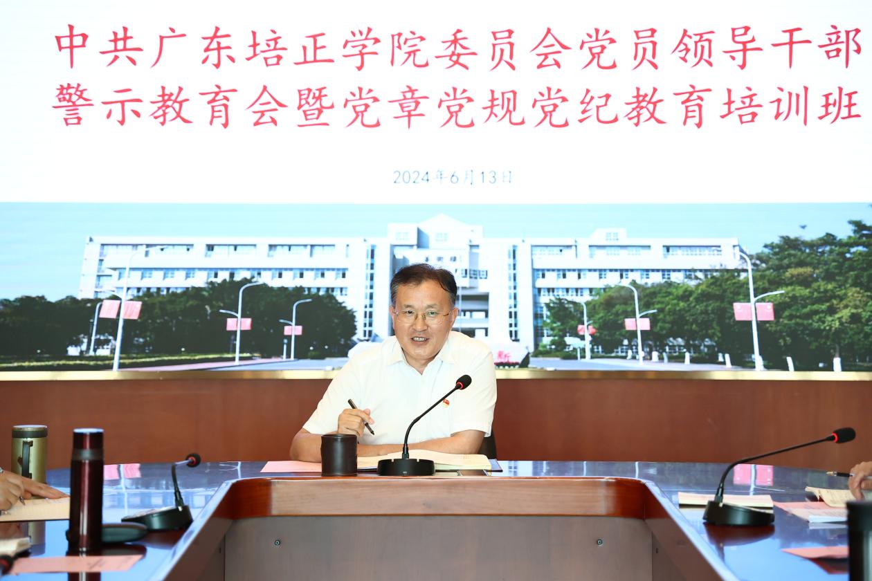 本网讯(党群工作部 郑菁华 林诺雯)为深入推进党纪学习教育,进一步严明政治纪律和政治规矩,引导党员干部知敬畏、存戒惧、守底线,增强廉洁自律意识,提高拒腐防变的能力,2024年6月13日下午,我校党委在行政楼会议室召开党员领导干部警示教育会暨党章党规党纪教育培训班。学校领导班子成员、全体中层干部参加培训。党委书记武电平主持。