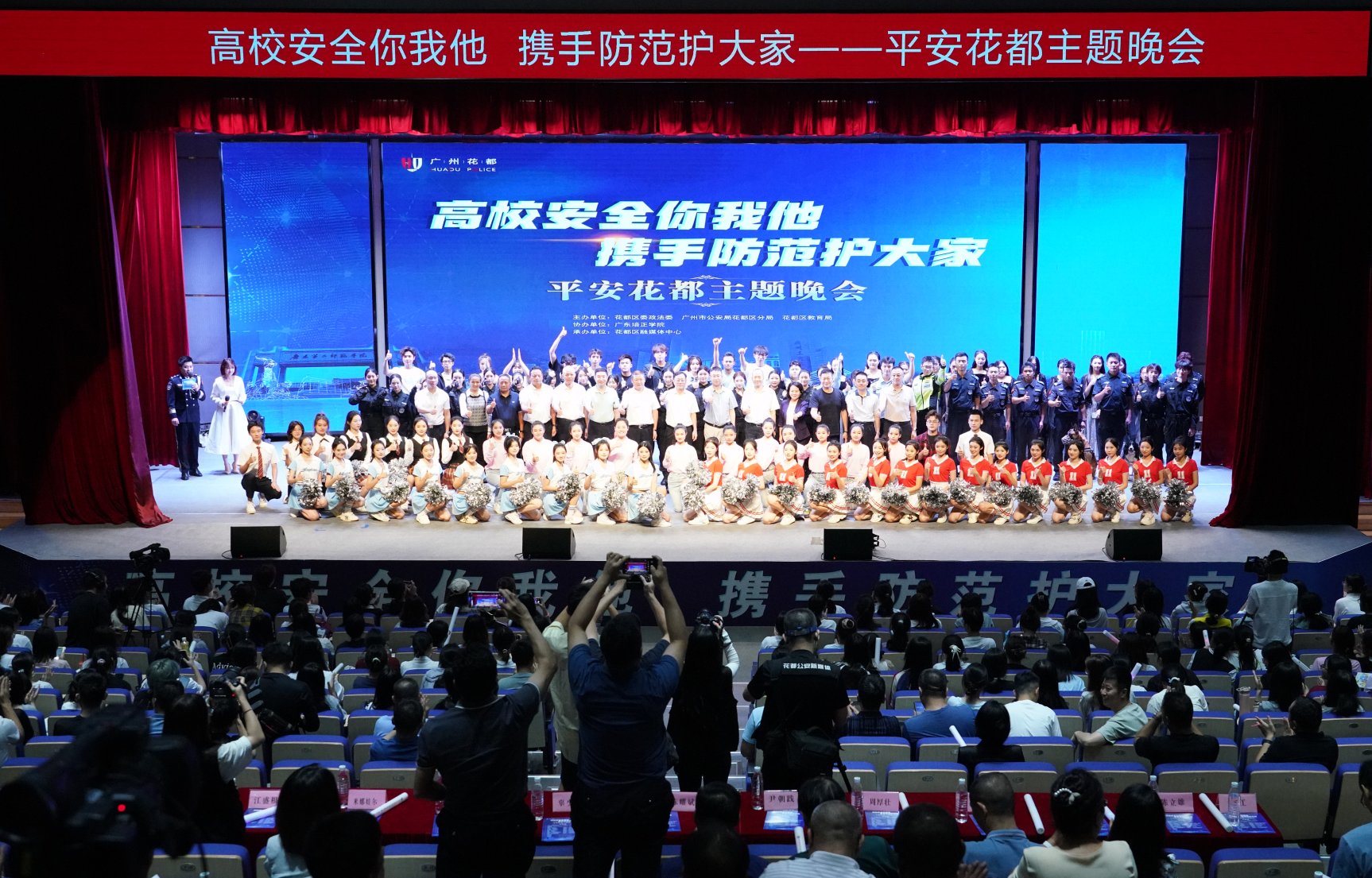 本网讯(保卫处 张志军)10月22日晚,由花都区区委政法委、公安分局、教育局主办,广东培正学院协办,区融媒体中心承办的“高校安全你我他,携手防范护大家”平安花都主题晚会,在我校成功举办。花都区委常委、政法委书记陈耀斌在晚会上讲话,花都区副区长、区公安分局党委书记、局长辜少辉等市区两级政法、公安、教育部门有关领导莅临现场,我校黄弢校长和武电平书记在会前会见了来校嘉宾,黄观德副校长出席活动,花都区各镇街主要领导及区内19所大中专学校有关人员到场观看演出。