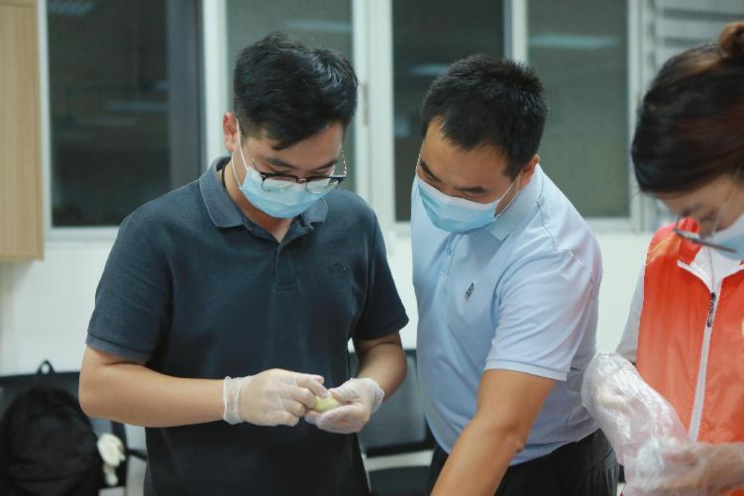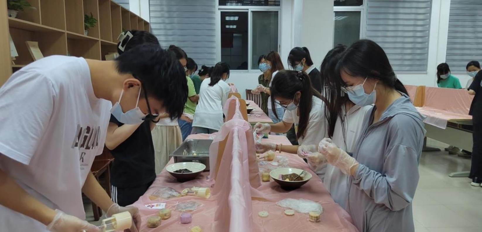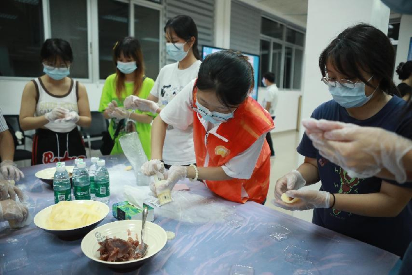 到了晚上,同学们带着喜悦和期待的心情早早就来到“一站式”学生社区服务中心,工作人员热情地引导同学们到月饼制作区域,为同学们发放了口罩和手套,并介绍了制作冰皮月饼的流程和注意事项,接着同学们纷纷开始尝试起来,他们相互帮助、交流着制作冰皮月饼的经验,现场欢乐气氛浓烈,笑声不断。