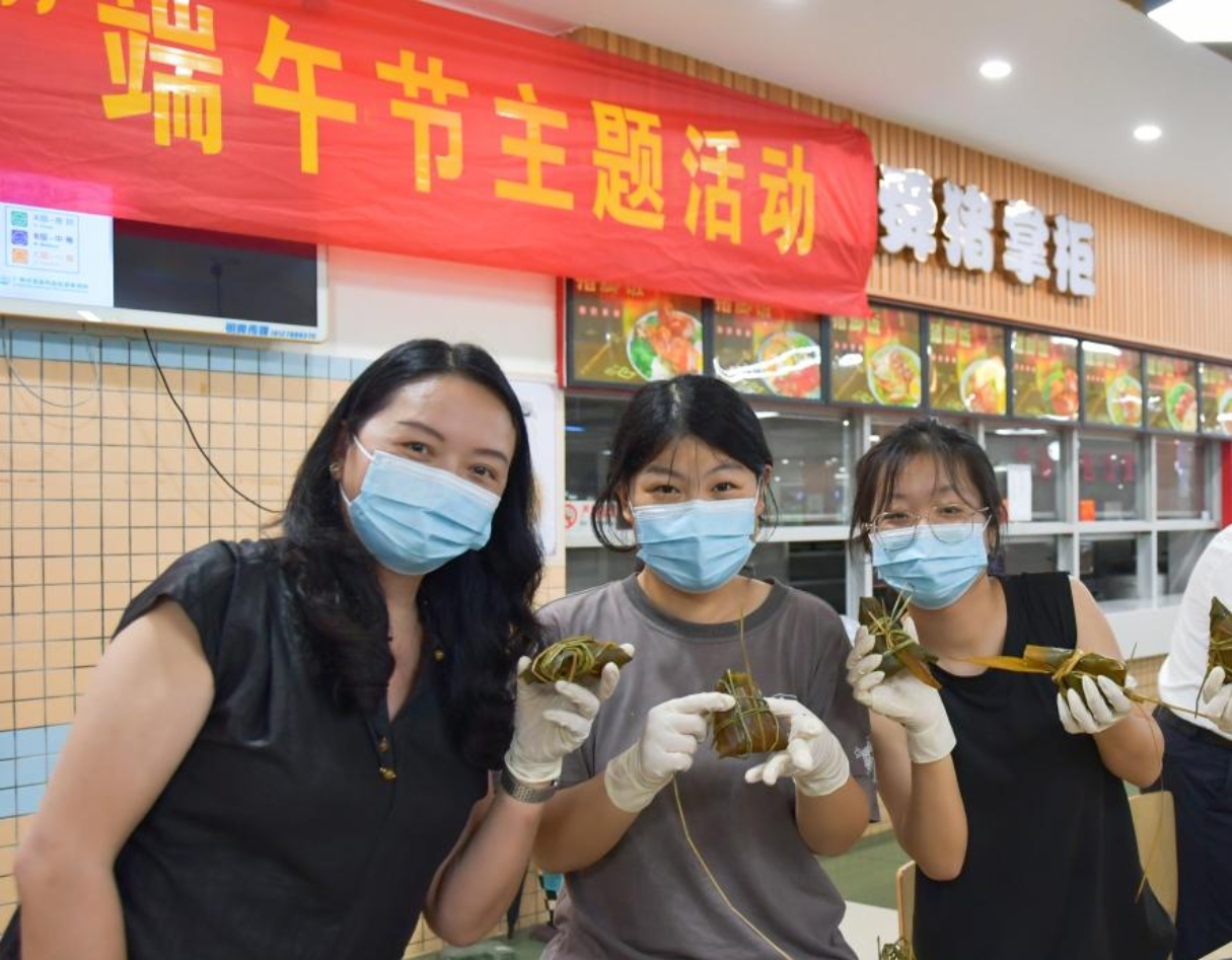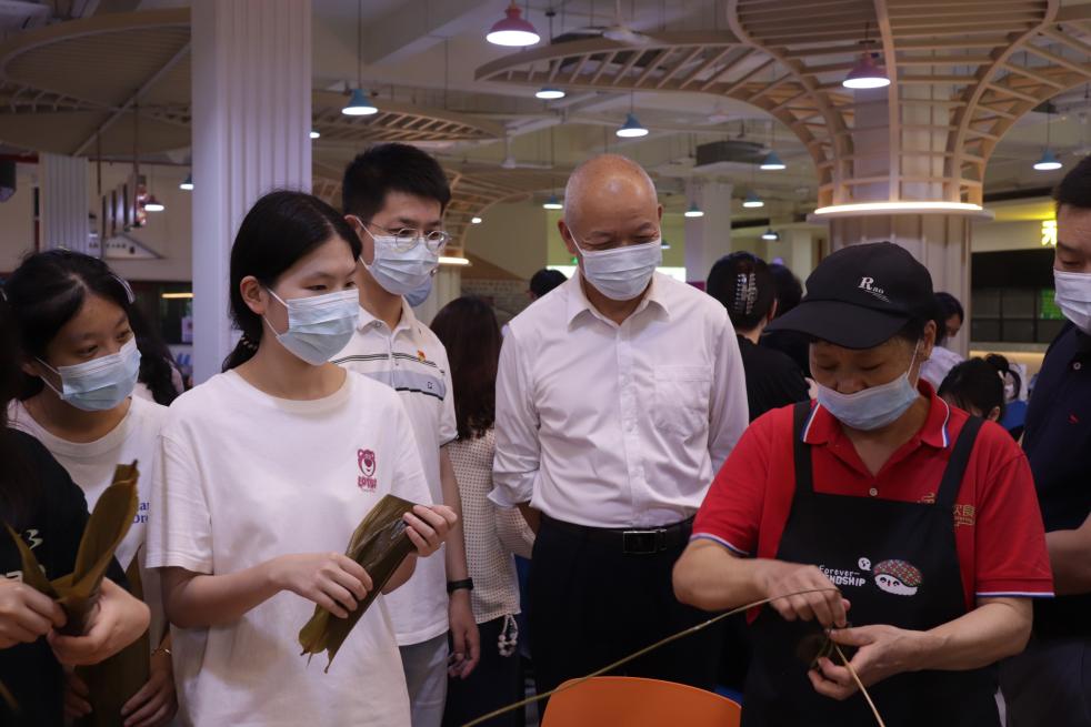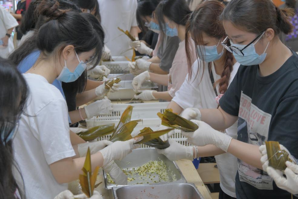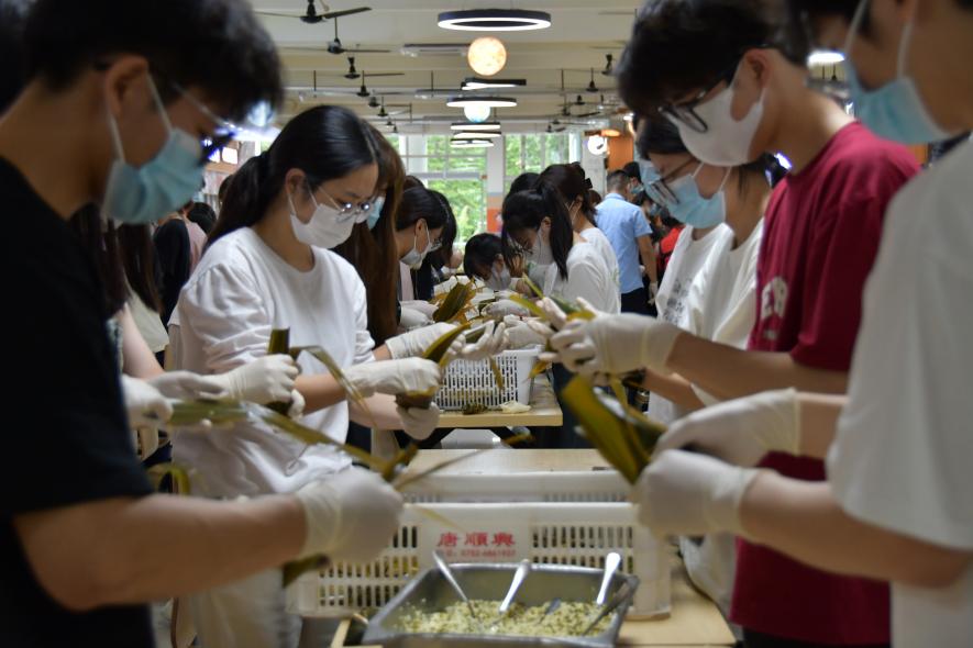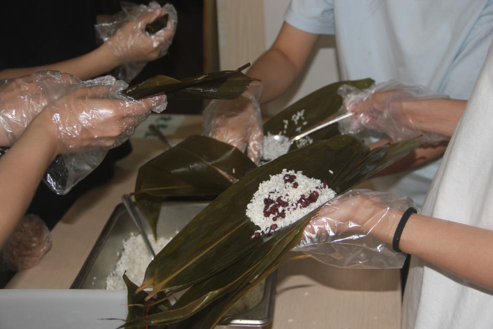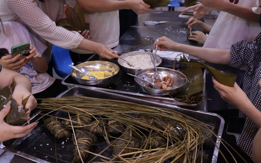 当天下午,粽叶、糯米和腌肉等新鲜食材整整齐齐地摆放学校饭堂的桌面上,一群学生围着食堂师傅,虚心请教如何包粽子。卷粽叶、填糯米、放配料、封口、扎线……经过简单学习后,同学们纷纷开始尝试起来,他们相互帮助、交流着包粽子的经验,笑声不断。