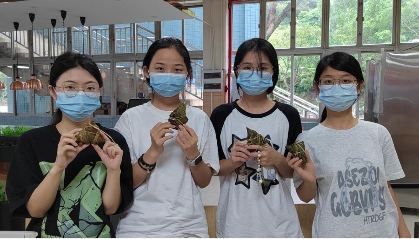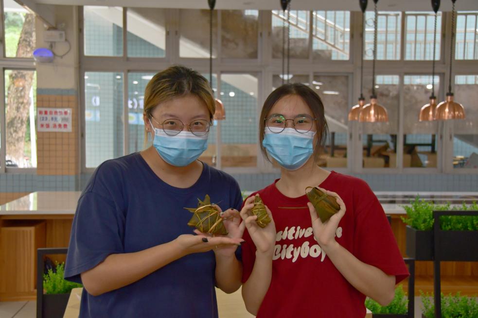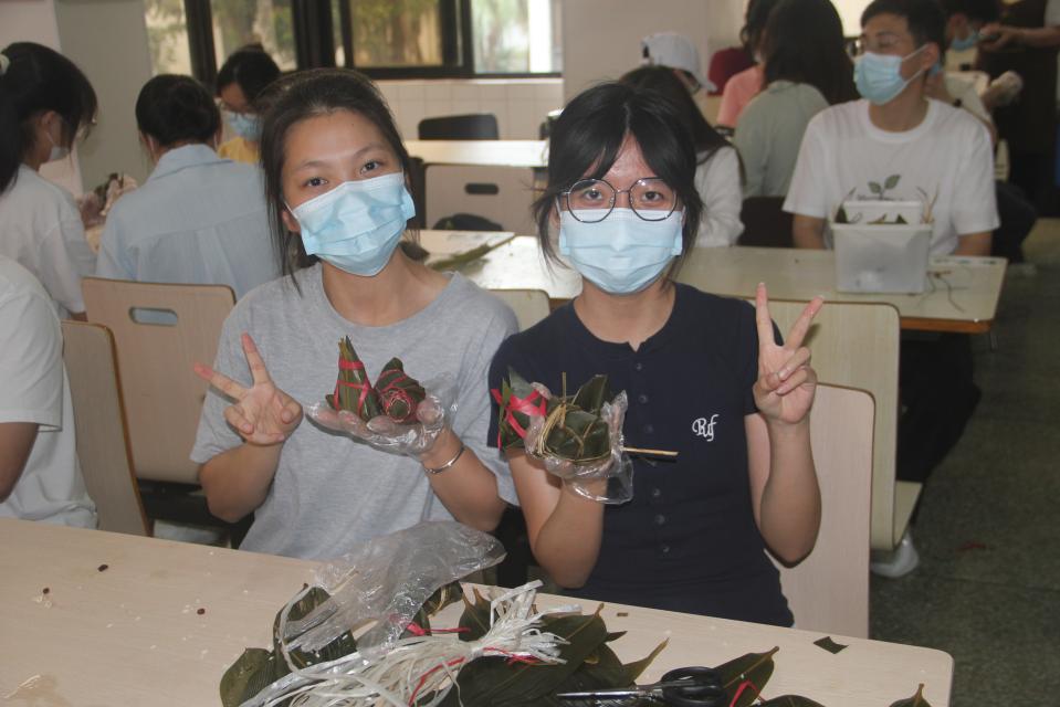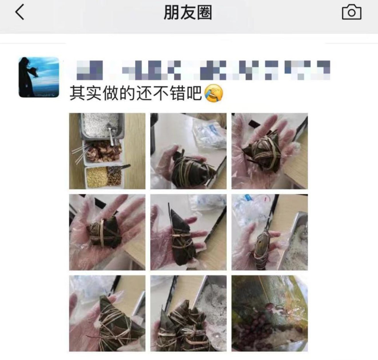 当天下午,粽叶、糯米和腌肉等新鲜食材整整齐齐地摆放学校饭堂的桌面上,一群学生围着食堂师傅,虚心请教如何包粽子。卷粽叶、填糯米、放配料、封口、扎线……经过简单学习后,同学们纷纷开始尝试起来,他们相互帮助、交流着包粽子的经验,笑声不断。