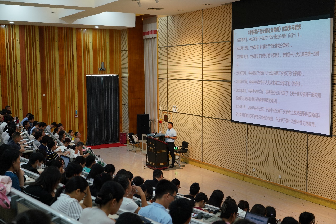 王高贺教授作专题辅导报告,他以独特视角解读新修订的《中国共产党纪律处分条例》。他从《条例》的历史演变讲起,逐步阐释《条例》修订的背景、意义、过程、特点等,围绕与高校党员干部密切相关的易混淆、易误解的内容,结合典型案例进行理论分析,重点解读了党的六项纪律相关条款,进一步明确了“六项纪律”的主旨要义和规定要求。他认为,学习好、执行好《条例》是广大党员干部学纪、知纪、明纪、守纪的必然要求。