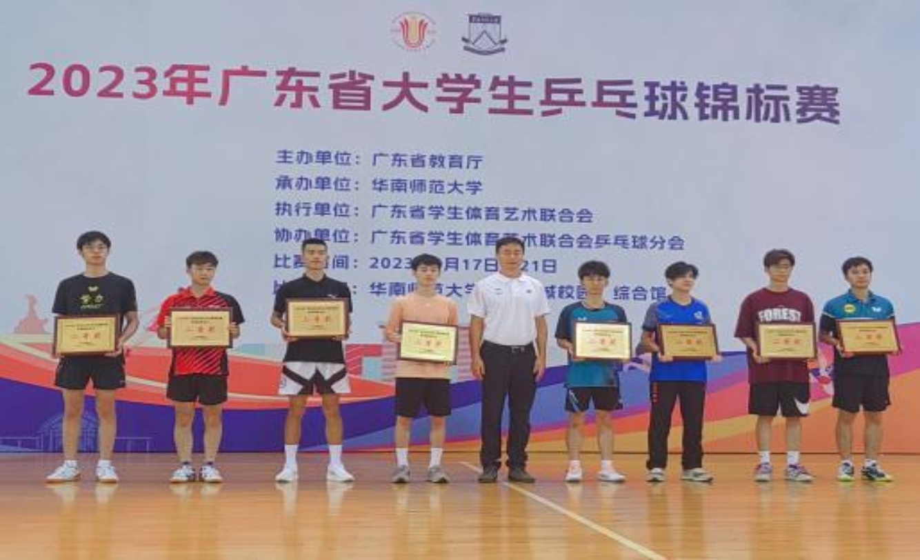 本网讯(体育学院 唐宁宁)为丰富同学们的课余生活,促进广大同学身心健康发展,打造健康和谐的校园体育文化氛围, 2023年5月17日,我校组队参加了由广东省教育厅主办、华南师范大学承办的2023年广东省大学生乒乓球锦标赛。