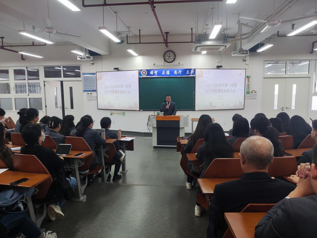 本网讯(会计学院 叶思华)1月15日上午,会计学院在5教308召开2023-2024学年第一学期学期工作总结大会。学校常务董事长梁普建、会计学院院长刘晓瑜、学院党委书记陈双红、教学副院长谭洪益以及学院全体教职工参加此次大会。会议由学院党委书记陈双红主持。