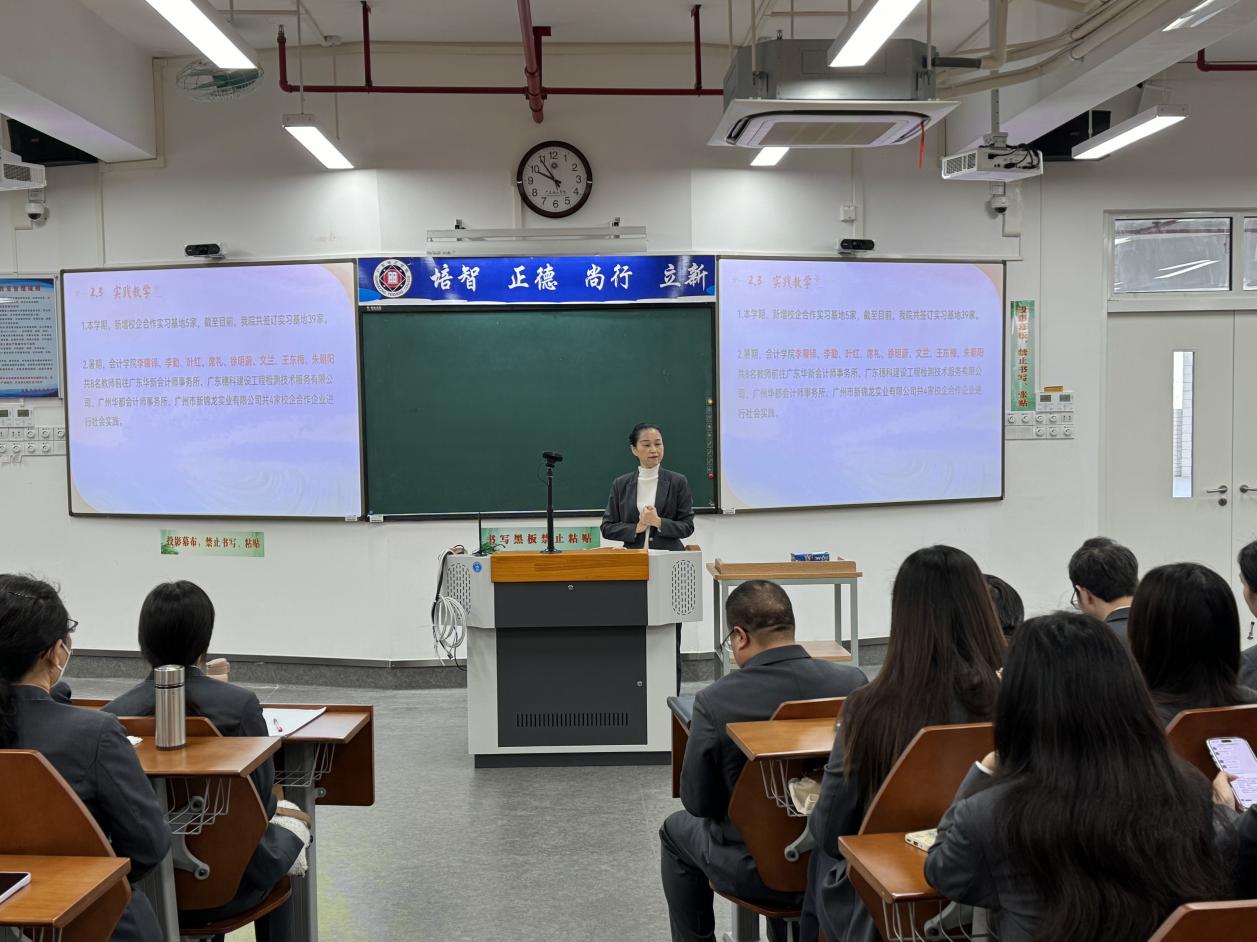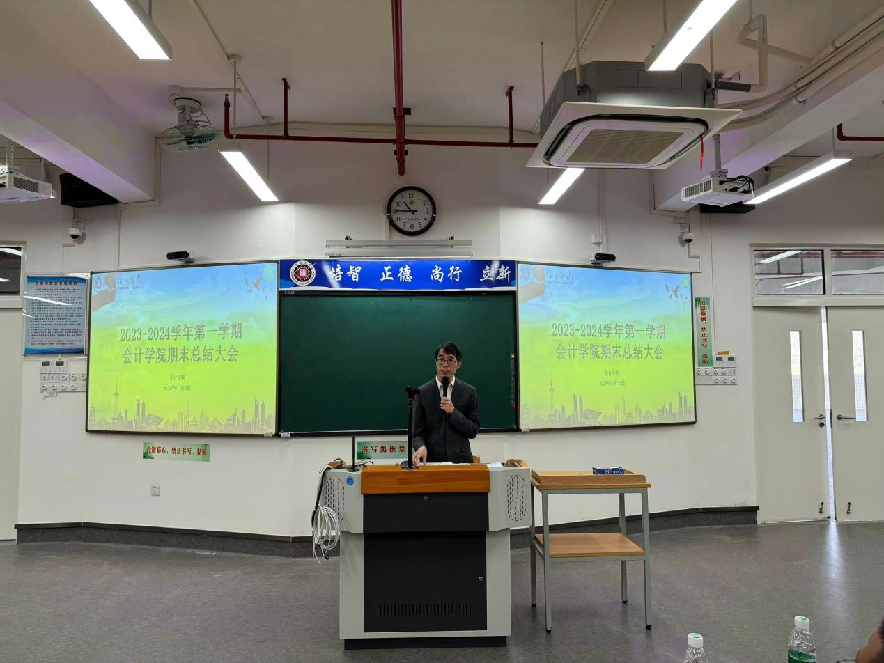 大会第二项,院长刘晓瑜对本学期学院的各方面工作进行总结。首先对近期新入职的老师进行简单介绍,并表示热烈的欢迎,希望新入职教师能尽快融入会计学院大家庭。随后,院长刘晓瑜从审核评估任务指标为主线,结合我院实际情况,从办学方向与地位、培养过程、教学资源与利用、教师队伍建设、学生发展、质量保障、其他工作、成绩亮点与不足、下一步的工作计划等九大方面做了详细的汇报。本学期我院在专业建设、学术科研、实践教学中心等方面都取得优异的成绩,《EXCEL财务》成为省级一流课程;谭洪益教授的《八进四融,数字赋能:财务数字化培养模式改革与实践》获得广东省高等教育学会专业改革优秀案例,并获校级教学成果奖一等奖。许文建老师发表北大核心期刊1篇。会计学院与百捷公司共建实验实训室6间,改造实训室2间,全面承担我院实验实训课程任务。院长刘晓瑜表示希望我院教职工在接下来的工作中,要提高课程思政育人能力,贯彻落实OBE教学理念,切实落实“以学为中心、以教为主导”的课程教学改革。