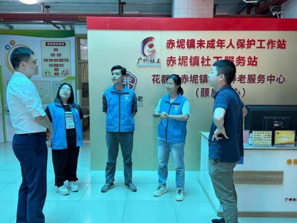 本次调研受到社工站的高度重视,首先,社工站欧嘉玲主任带领到访师生参观了赤坭镇社工服务站功能室,并介绍社工站内现有设置的配套设施,据了解赤泥镇社工站开设星光老人之家、亲子活动室、书画室、母婴室、阅览室等服务功能室,设备完善,环境温馨舒适,可供居民预约使用。在社工工作模块方面,社工站以“党建引领,乐善赤坭”为服务主题,为赤坭镇辖区内居民提供党建引领服务、重点服务、长者服务、家庭服务、青少年服务、义工服务等特色服务。