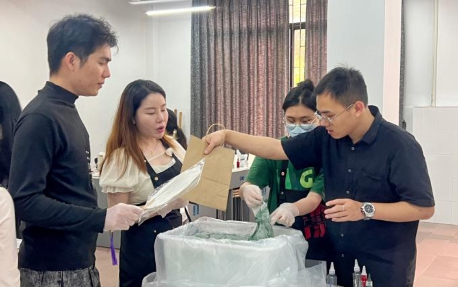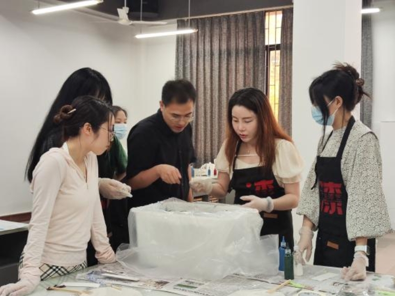 4月19日,先由漆艺专业教师郑博文老师带领参观广东漆艺传承基地,通过讲解漆艺传承和普及情况让辅导员们更加了解基地。随后在郑老师的指导下,学工老师们进行了团扇、书签以及牛皮袋的制作,在制作实践过程中穿插讲授了中华优秀传统文化——广东漆艺的知识,让参与的学工老师们在实践中掌握了一定的美育知识与技能。