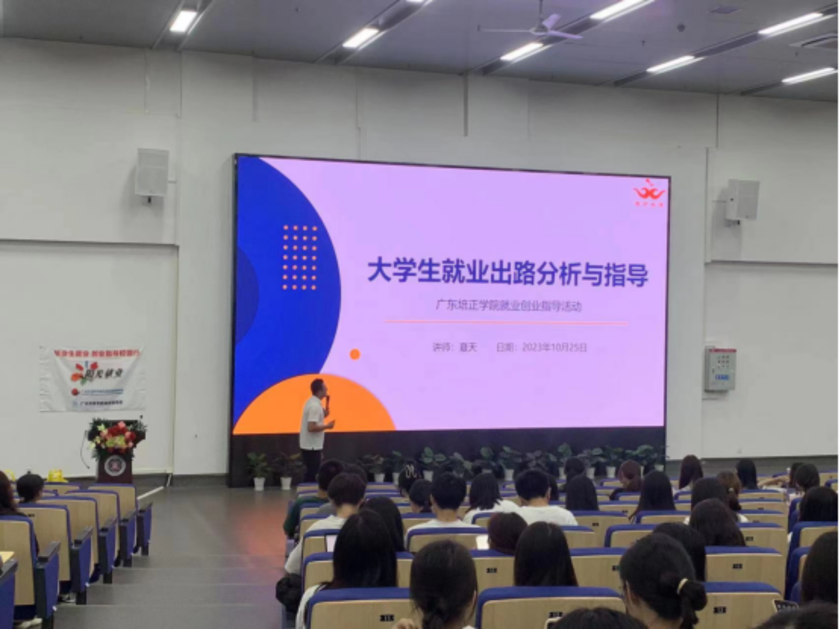 本网讯(招生就业与继续教育处 黄文婷)为落实做好2023年广州市“公共就业服务进校园”活动相关工作要求,10月25日下午,由广州市高校毕业生就业指导中心指导,广州市青年就业创业协会主办,广东培正学院就业创业e站承办的“阳光就业·事业扬帆”就业创业指导进校园活动之大学生就业出路分析与指导讲座在学校第五教学楼108报告厅举行。本次讲座由美好生涯(佛山)教育科技有限公司总经理夏天担任主讲嘉宾。