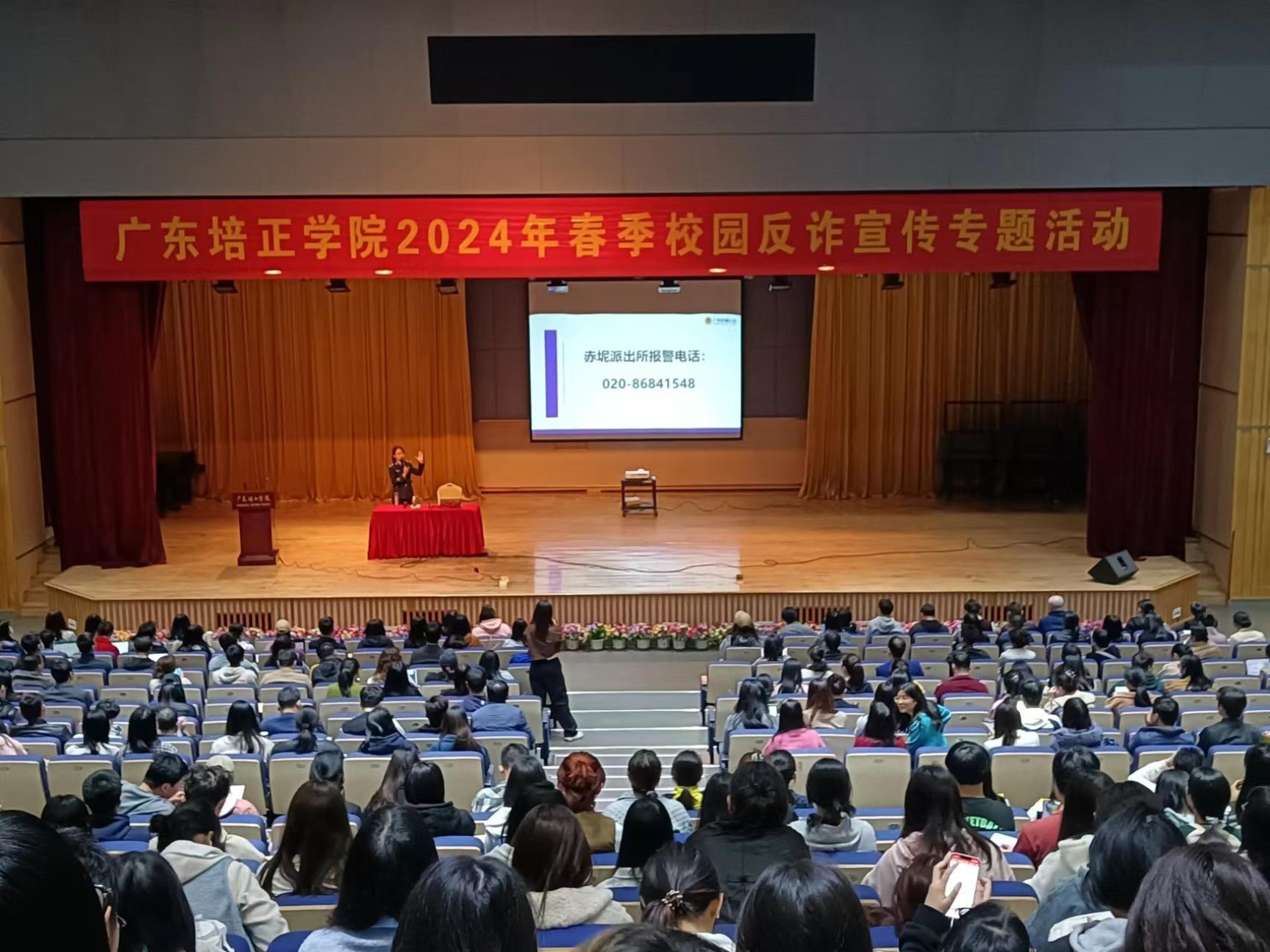 本网讯(保卫处 张志军)3月13日下午,我校在学校礼堂举办2024年春季“反诈”专题宣讲活动,教职工代表、全体辅导员、各部门安全员及各班级学生宣传骨干近1000人参加,活动由花都区公安分局反诈中心林思贝警官主讲,花都区反诈中心杜鑫华中队长、赤坭派出所梁志标警官等出席活动,赤坭镇综治办、联通公司同步到校开展安全宣传。