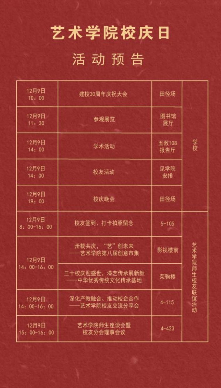 本网讯(艺术学院 缪丽泽(老师))2023年12月9日,广东培正学院30周年校庆庆典活动。在这喜庆的日子里历届校友齐聚一堂,共叙同窗师生情谊。学校通过多种形式全面展现学校三十年来的办学成果和师生风采,继续书写教育高质量发展新篇章,接下来一起回顾一下校庆当天艺术学院的系列活动!