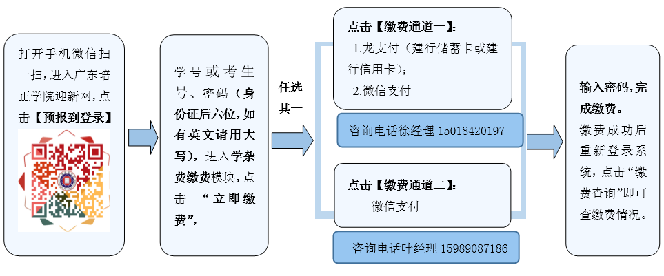 有生源地贷款的学生,缴费前务必先登录迎新网站pzyx.peizheng.edu.cn,点击“预报到登录”,用户账号为录取通知书的学号或考生号、密码(身份证后六位,如有英文请用大写),点击“绿色通道”,上传生源地贷款回执,填写回执校验码及缓交金额,提交后等待系统审核(系统每日进行审核),审核通过后完成缴费。咨询电话:020-86710509绿色通道咨询电话:吴老师020-86710509。(暑假值班时间8:00-16:00、17:00-20:00)
